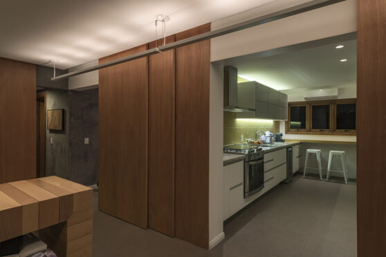 Para satisfazer o desejo do casal jovem que procurava apartamento com bastante espaço social e que tivesse cores vivas, além de confortável à criação de pets , a melhor solução foi reformar um apartamento de três dormitórios dos anos 1980, construído em um simpático condomínio de três blocos e muito jardim no térreo. A excessiva compartimentação deste apartamento, inclusive com paredes em ângulo, levou o projeto na direção de uma reforma radical, com demolições de paredes e aproveitamento estético da estrutura de concreto armado do edifício. Um dos dormitórios, o corredor de circulação e o terraço com churrasqueira foram incorporados à antiga sala, abrindo espaço para um grande ambiente social. Em contrapartida, para garantir privacidade quando necessária, criou-se um sistema de painéis deslizantes que permitem o isolamento dos dormitórios, do home office e da cozinha.